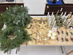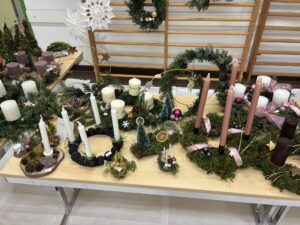Der beliebte Adventsbasar fand in diesem Jahr wieder statt. An zwei Abenden trafen sich die Eltern in der Turnhalle um gemeinsam für den Basar zu Basteln. Es wurden zahlreiche Kränze gebunden, Gestecke hergestellt, Sterne, Kerzen und viele weitere adventliche Dekorationsartikel hergestellt. Am Freitag fand dann am Nachmittag der Verkauf statt. Viele Familien in Mainburg warten schon darauf sich einen liebevoll gestalteten Adventskranz zu kaufen, der preislich erschwinglich ist. Natürlich konnte man dabei auch eine Tasse Punsch oder Glühwein genießen.